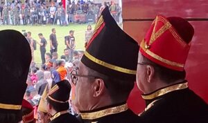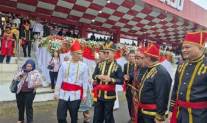 Hadir di tengah barisan tamu kehormatan, Bupati Minahasa Utara, Joune Ganda, tampil memukau dengan balutan busana adat Minahasa yang sarat makna. Didampingi Kepala Badan Kesbangpol Minut, kehadiran Joune bukan sekadar seremoni, melainkan bentuk penghormatan mendalam terhadap jejak perjuangan para leluhur.