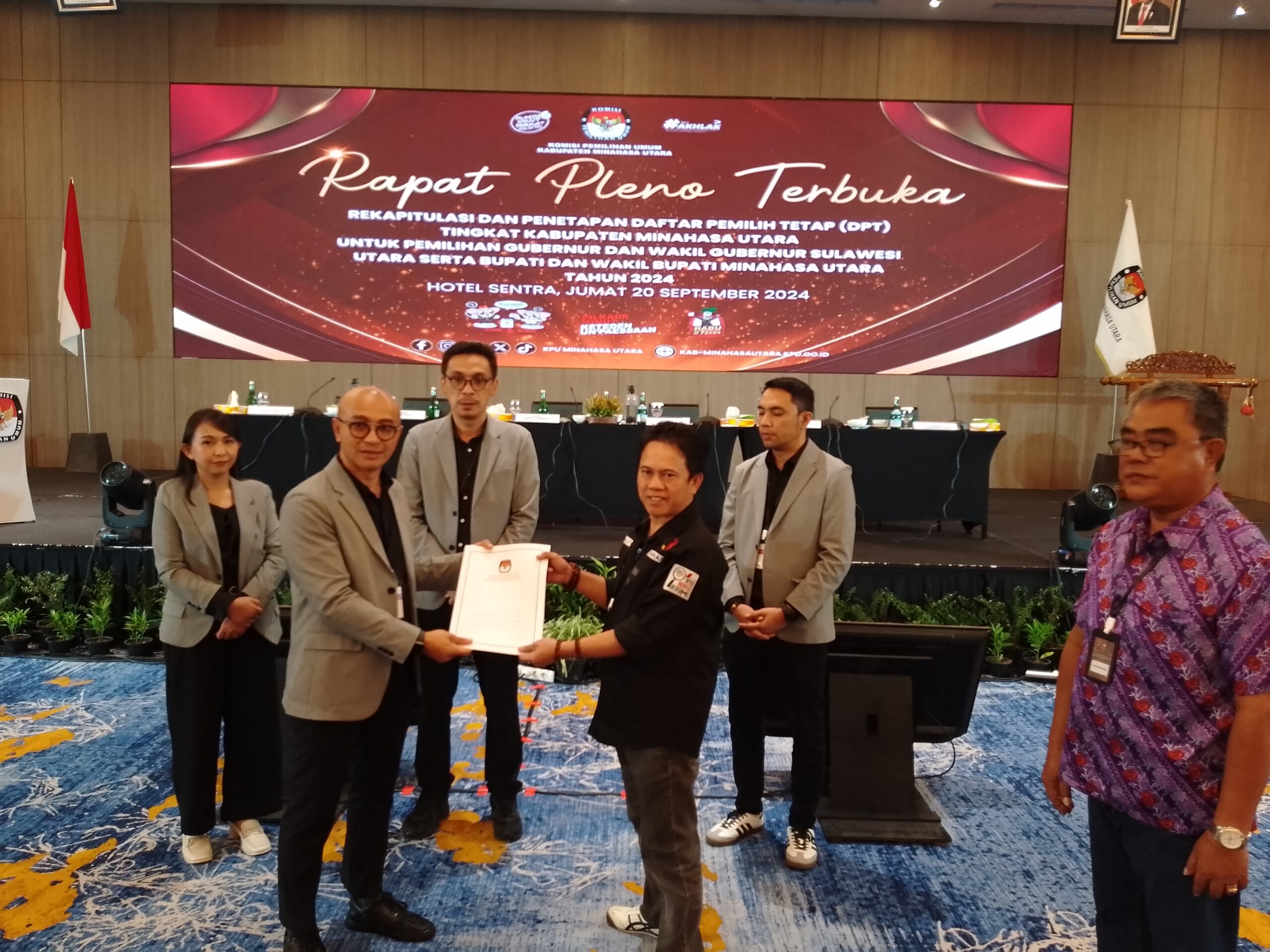 Narasione.com, Minut- Komisi Pemilihan Umum (KPU) Kabupaten Minahasa Utara menggelar Rapat Pleno Terbuka Rekapitulasi dan Penetapan Daftar Pemilih Tetap (DPT) Tingkat Kabupaten Minahasa Utara Untuk Pemilihan Gubernur dan Wakil Gubernur Sulawesi Utara Serta Bupati dan Wakil Bupati Minahasa Utara Tahun 2024, Jumat (20/9/2024) di The Sentra Hotel Manado.