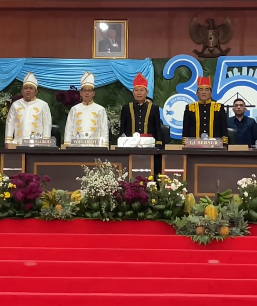 Sulut,Narasione.com- Gubernur Sulawesi Utara Mayjen TNI (Purn) Yulius Selvanus SE bersama Wakil Gubernur Dr Victor Mailangkay, Senin (13/10) menghadiri Rapat Paripurna dalam rangka memperingati Hari Ulang Tahun (HUT) Kota Bitung ke-35.